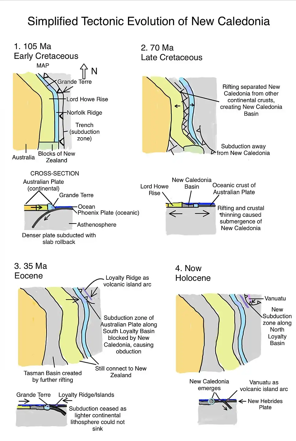 - ^ a b c d e f g h i j k l m n o p q r s t u v w x y z aa ab ac ad ae af ag ah ai aj ak al am an ao ap aq ar as at au av aw ax ay az ba bb bc bd be bf bg bh bi bj bk bl bm bn bo bp bq br bs bt bu bv bw bx by bz ca cb cc cd ce cf cg ch ci cj ck cl cm cn co cp cq cr Cluzel, Dominique; Maurizot, Pierre; Collot, Julien; Sevin, Brice (March 2012). "An outline of the Geology of New Caledonia; from Permian-Mesozoic Southeast Gondwanaland active margin to Cenozoic obduction and supergene evolution". Episodes. 35: 72–86. doi:10.18814/epiiugs/2012/v35i1/007. Retrieved 26 September 2021.