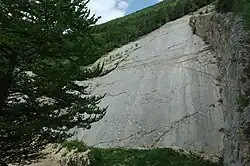 On the French Jura side, three sites have been identified.[a 12] The oldest footprints were discovered in 2006 in the Bois aux Salpêtriers quarry in Loulle.[50] The footprints are located in oncolite and peloidal limestones of the Couches du Morillon formation, corresponding to an intertidal environment.[51] The footprints are dated between the Upper Oxfordian and the Lower Kimmeridgian and are the oldest from the Upper Jurassic in the Jura. Three surfaces have been described, containing nearly 1,500 footprints and forming 23 sauropod trackways (ichnogenera Brontopodus and Parabrontopodus) and 3 theropod trackways (ichnogenera Carmelopodus and Megalosauripus). Each surface corresponds to different phases of emergence. A trackway measuring between 27 and 32 meters and containing approximately 170 footprints has been described in the Couches du Chailley formation[note 8] (Upper Kimmeridgian to Tithonian) in Coisia, on a near-vertical slab along the departmental road D 60E1.[52][53] This formation is also interpreted as a subtidal environment, such as a lagoon protected by a coral reef and subject to phases of emergence (supratidal environment), during which the footprints were imprinted in the sediment. These footprints correspond to the ichnogenus Parabrontopodus. Their dimensions link them to Diplodocus individuals measuring 24 meters in length. Another outcrop located 1 kilometer away[54] suggests that the site may be much larger. Finally, a last site has been identified in La Plagne near Saint-Germain-de-Joux, in the same formation as Coisia, the Couches du Chailley formation, but dated to the Lower Tithonian.[55] These footprints are attributed to the ichnogenus Brontopodus, with some belonging to a newly identified species, Brontopodus plagnensis. Moreover, the site hosts the longest known sauropod trackway in the world, measuring 155 meters.