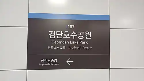 Geomdan Lake Park station (Korean: 검단호수공원역) is a Line 1 subway station of the Incheon Subway in Seo-gu, Incheon, South Korea. This station is a northern terminus of Line 1. It opened on June 28, 2025.[1]