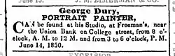He quickly relocated to the more promising city of Nashville, Tennessee, the following year, in 1850. Initially Dury taught oil painting at the Nashville Female Academy.[10] Dury also set up a second-story studio at No. 43 Union Street, accepting commissions as a portrait artist.[11][7][8][12]