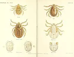 Nuttall made extensive studies on ticks in collaboration with Cecil Warburton L.E. Robinson and F.W. Cooper. This led to numerous papers and an exhaustive monograph that appeared in three parts between 1908 and 1915.[44] The publications, mostly in the journal Parasitology cover the anatomy, biology and classification of ticks, as well as observations on the diseases they transmit, including "tick paralysis".[45] In the course of this work, Nuttall accumulated a very large collection of ticks from many parts of the world.[1] The collection is now in the Natural History Museum, London.[5]