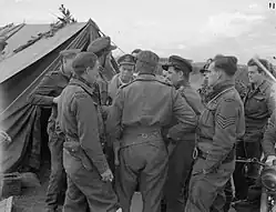 In December Hill was sent to Africa, eventually being given a posting in early 1943 as a flight commander in No. 111 Squadron.[1] At the time, the squadron was based at Souk-el-Khemis Airfield and equipped with Spitfire Mk Vcs.[6] It was flying extensively during the Allied advance into Tunisia and Hill claimed two Messerschmitt Bf 109 fighters as damaged near Souk-el-Khemis on 4 February. He shot down a Bf 109 on 23 February and the following day shared in the destruction of a Fw 190. At the end of the month he shared with two other pilots in the shooting down of a Bf 109. On 4 March he destroyed two Junkers Ju 87 dive bombers, plus damaged another of the same type, all near Béja. Hill damaged a Bf 109 near Hammam on 5 April and three days later, claimed a Fw 190 as damaged and another Fw 190 as probably destroyed north of Majaz al Bab. He damaged another Bf 109 on 11 April and repeated the feat the next day, damaging two more fighters of the type. He claimed a Bf 109 as probably destroyed over La Sebala Airfield on 20 April and the same day was also credited with a Bf 109 as damaged. He shot down Bf 109s on 21 and 23 April and at the end of the month was promoted squadron leader and given command of the squadron.[1][6]
