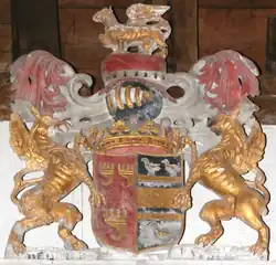 - Secondly in 1598 to  Grace Viell (d.1645), widow of Peter Bevill of Killigarth, Cornwall and daughter and co-heiress of William Viell of Trevorder, Cornwall by his wife Jane Arundell, daughter of Sir John Arundell of Trerice, Cornwall. By Grace he had one daughter:Heraldic achievement of Sir Bevil Grenville atop his monument in Kilkhampton Church, displaying arms of Grenville (Gules, three clarions or) impaling Smith of Exeter (Sable, a fess cotised between three martlets or)[12] - Grace Smith, wife of the heroic Civil War Royalist commander Sir Bevil Grenville (1596–1643) of Bideford in Devon and Stowe, Kilkhampton in Cornwall, killed in action at the Battle of Lansdowne (1643) and a Member of Parliament for Cornwall 1621–1625 and 1640–1642, and for Launceston 1625–1629 and 1640. She was the mother of John Grenville, 1st Earl of Bath (1628–1701) and her other thirteen children were by Royal Warrant of Precedence granted the rank and title of Earl's children by King Charles II on 20 August 1675, in recognition of their father's services.[13] The arms of Smith are shown impaled by Grenville on top of the monument of Sir Bevil Grenville in Kilkhampton Church.