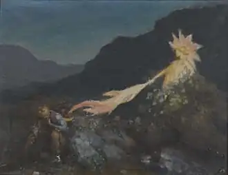 He claimed to see nature spirits and made paintings about them, such as the sídhe, elven or faerie beings in Irish folklore.[19][20] On one occasion, he showed some drawings he had made of them to a peasant, who would have pointed out that he had already seen many of those entities.[20] In 1889 he had traveled with W. B. Yeats to a town in County Galway, where Russell also painted these spirit beings, and a Druid is said to have appeared to them in vision.[21] The previous year, in a letter to Yeats, Russell had stated: