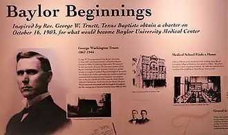Truett forgoes the position of becoming President of Baylor University to follow his ministerial call accepting the position as pastor of the First Baptist Church in Dallas in September 1897, a position he would hold until his death.[4] During the forty-seven year pastorate, the membership rolls increased from 715 to 7,804; a total of 19,531 new members were received, and total contributions were $6,027,741.52.[1][4] The church was rebuilt three times during his tenure there to accommodate the expanding congregation.[2] His preaching made him nationally famous, as he criss-crossed the nation leading revivals, participating in religious organizations, and raising funds for churches. He was a leader in the national "Seventy-Five Million Campaign," but the financial results were disappointing. In Texas he led the fundraising for the Texas Baptist Memorial Sanitarium, the forerunner of Baylor Hospital. He avoided politics except for prohibition issues and gambling.[7]