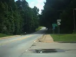 Between August 1950 and the beginning of 1952, the entire Powder Springs–Marietta segment had a completed hard surface. A portion north-northeast of McWhorter had a sand clay or top soil surface.[37][38] In 1953, the northern two-thirds of the McWhorter–Douglasville segment was hard surfaced. A portion east of Roopville had a sand clay or top soil surface. Three segments had completed grading, but was not surfaced: from the Alabama state line to Roopville, the Carroll County portion of the Whitesburg–McWhorter segment, and a portion north-northeast of McWhorter.[39][40] Between June 1955 and July 1957, a portion east of Roopville had completed grading, but was not surfaced.[41][42] Between July 1957 and June 1960, three segments were paved: the central portion of the Bucktown–Roopville segment, the western half of the Roopville–Whitesburg segment, and from southwest of Whitesburg to north-northeast of McWhorter.[42][43] By June 1963, the segment from west-northwest of Tyus to Roopville was paved.[43][44] By the end of 1965, the segment from the Alabama to east-southeast of Lowell was hard surfaced. The segment from east-southeast of Lowell to south-southwest of Whitesburg had a "topsoil or gravel" surface. At this time, SR 5 Byp. was built and hard surfaced from US 76/SR 5 southwest of Blue Ridge to SR 5 north of the city.[44][45] In 1966, SR 5 was hard surfaced from Alabama to Douglasville.[45][46] In 1973, SR 705 was proposed from SR 3 (Church Street) in Marietta to SR 5 south of Blackwell, with an interchange with I-75.[47][48] In 1977, I-575/SR 713 was proposed from I-75 north of Marietta to just south of the Cherokee–Pickens county line. It was completed from SR 140 south of Canton to SR 20 east of the city.[49][50] The next year, the entire Cobb County portion (except for the southern end) of I-575/SR 713 was under construction. SR 5 through Blue Ridge was shifted westward, replacing the entire length of SR 5 Byp. Its former path through the city was redesignated as SR 5 Bus.[50][51] By the end of the decade, SR 733 was proposed between two intersections with US 76/SR 5 northeast of Ellijay. At this time, SR 734 was proposed from US 76/SR 5 south-southwest of Cherry Log, across US 76/SR 5 north-northeast of Cherry Log, and then to another intersection with US 76/SR 5 in Lucius.[52][53]