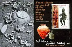 Bronze statue from the 7th century BC discovered during archaeological excavations in the city of Vani. This statue is the statue of a Tamada, a toast master. The sheet also pictures amphora that were used at this time to carry and to stock the wine. Stamp of Georgia, 2007.