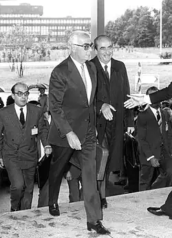 Following the 1977 election, he served first as Minister for Coordination, before becoming Minister for Foreign Affairs in May 1978.[3][11] He was the first Greek Foreign Minister to visit the Soviet Union, in October 1978, and negotiated Greece's accession to the EEC, signing Greece's accession agreement in May 1979.[3] He also worked to restore relations with Bulgaria and Yugoslavia.