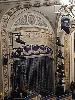 On either side of the stage is a wall section with three boxes at the balcony level. The boxes step downward toward the stage; the front box curves forward into the proscenium arch, while the rear box curves backward into the balcony.[34] At the orchestra level, there are three rectangular openings, corresponding to the locations of former boxes on that level.[35] The front railings of the boxes contain acanthus-leaf arabesques.[12][32] The underside of each box is decorated with a medallion containing a light fixture; this is surrounded by a molded band.[35] Above the boxes on either side is an elliptical arch, which contains a curved pediment with acanthus-leaf arabesques on either side of a central medallion. Above the elliptical arch on either side is an arched lunette panel, which supports the ceiling's sounding board.[12][32]