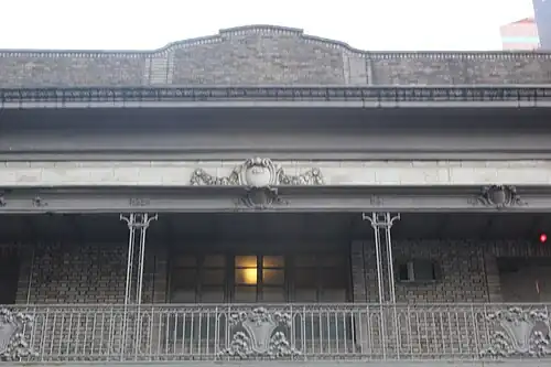 Both the curved corner and the 45th Street facade contain terracotta frames, which are flanked by terracotta pilasters with stylized capitals. Along 45th Street, the auditorium's second and third floors contain a fire escape made of cast iron and wrought iron. There are doors and windows on both levels, leading to the fire escape. In addition, the fire escape's third-floor railing contains cast-iron depictions of ribands and shields, while a sheet-metal canopy covers the fire escape. Above the center of the third floor, on 45th Street, is a terracotta cartouche containing depictions of swags. The curved corner contains a third-floor window, topped by an oval escutcheon that is decorated with swags and fleur-de-lis. A terracotta cornice and a brick parapet run above the auditorium facade.[23][24] The parapet is stepped and contains a coping made of sheet metal.[24]
