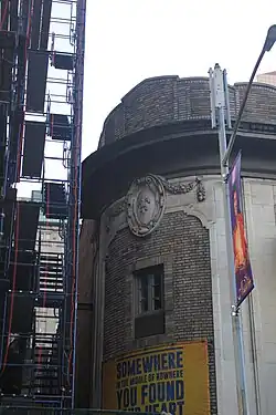 The ground floor of the auditorium contains a water table made of granite.[21] The rest of the facade is largely made of architectural terracotta, which surrounds patches of buff brick in Flemish bond.[12][21] Along the ground floor on 45th Street, there are three glass-and-bronze double doors with aluminum frames and transoms, which lead to the lobby. There are display boxes on either side of the lobby doors, and a bronze stage door is to the right (west) of these doors. A marquee extends above the doors.[22] The northeastern corner of the facade is curved and contains an entrance to the ticket lobby. This entrance contains a double door, above which is a glass transom panel. The corner entrance is topped by a broken pediment, which is supported by console brackets on either side and contains an escutcheon at the center.[23][24]