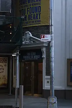 The Schoenfeld is part of the largest concentration of Broadway theaters on a single block.[5] The adjoining block of 45th Street is also known as George Abbott Way,[6] and foot traffic on the street increases box-office totals for the theaters there.[7] The Broadhurst, Schoenfeld, Booth, and Shubert theaters were all developed by the Shubert brothers between 44th and 45th Streets, occupying land previously owned by the Astor family.[8][9] The Broadhurst and Schoenfeld were built as a pair, occupying land left over from the development of the Shubert and Booth, which were also paired.[10][11] The Broadhurst/Schoenfeld theatrical pair share an alley to the east, parallel to the larger Shubert Alley east of the Shubert/Booth pair.[8][12] The Broadhurst/Schoenfeld alley was required under New York City construction codes of the time but, unlike Shubert Alley, it was closed to the public shortly after its completion.[13] The Shuberts bought the land under all four theaters from the Astors in 1948.[9][14]