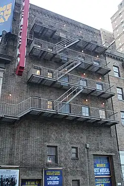 The stage house is six stories high. The 45th Street facade is made of buff brick, containing interspersed diamond patterns, and the side walls are faced with plain brick. The ground floor of the stage house contains a granite water table with two metal doors. The western door is double-height, allowing large sets to be transported into the theaters, while the eastern door contains signboard panels. The stage house has five sash windows on each of the third through sixth stories. These windows are placed within segmental arches made of brick. There is a metal fire escape in front of the stage house, which leads to the fire escape in front of the auditorium's third story. A parapet with corbels runs above the sixth story of the stage house.[23][24]