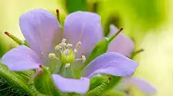 The inflorescence is a cluster of one to several small flowers. Each flower has five-pointed sepals which can be as long as the petals, and five-notched petals in shades of white, light pink to lavender. This is a distinguishing factor for discriminating G. carolinianum from other species of Geranium. The flowers form in short tight clusters which grow off the main stems. The anthers do not have nectar spurs. The carpels have hair and are fused together. There are five carpels and one pistil. The petals are rounded. The color of the sepals is green to brown; they are ovate. Despite being thin, dry and paper-like, the sepals are flexible.[7] The plant does not persist after flowering. Flowers of G. carolinianum bloom from late March through July. They do not give off any strong aroma or scent to attract pollinators into visiting the flower, relying solely on visual stimuli to attract insects to their sap.