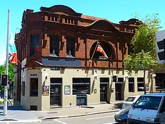 Just before she graduated from Melbourne in 1959 with an upper second, she moved to Sydney, where she became involved with the Sydney Push and the anarchist Sydney Libertarians. "[T]hese people talked about truth and only truth", she said, "insisting that most of what we were exposed to during the day was ideology, which was a synonym for lies—or bullshit, as they called it."[28] They would meet in a back room of the Royal George Hotel on Sussex Street. Clive James was involved with the group at the time. One of Greer's biographers, Christine Wallace, wrote that Greer "walked into the Royal George Hotel, into the throng talking themselves hoarse in a room stinking of stale beer and thick with cigarette smoke, and set out to follow the Push way of life, 'an intolerably difficult discipline which I forced myself to learn'". Greer already thought of herself as an anarchist without knowing why she was drawn to it; through the Push, she became familiar with anarchist literature.[29] She had significant relationships in the group with Harry Hooton[30] and Roelof Smilde, both prominent members. She shared an apartment with Smilde on Glebe Point Road, but the relationship did not last; according to Wallace, the Push ideology of "free love" involved the rejection of possessiveness and jealousy, which naturally worked in the men's favour.[31]