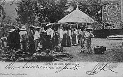 The first German colonists arrived in the mid-19th century, and soon German settlers acquired land and operated coffee plantations in Alta Verapaz and Quetzaltenango. Cobán became an important center for German settlers. Other German operations cultivated tea, cocoa, and vanilla.[5] While most Germans went to Cobán, others went to San Juan Chamelco and Xelaju (Quetzaltenango). Cobán later came to be monopolized by German trade in wholesale stores, but they and, to a greater extent, the fincas dispersed throughout almost the entire region of Alta Verapaz. They paid workers with coins minted by each owner. These currencies could only purchase in the company store of the finca, whereby the employer obtained extra pecuniary gain.[6]