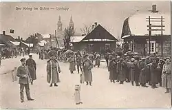 On the Russian-German front, the war began with battles in East Prussia, Poland, and Galicia. The Lithuanian-Belarusian provinces located near the theater of military operations were declared under martial law. Strikes, meetings, processions, demonstrations were prohibited, military censorship was introduced. The territory of Belarus turned out to be part of the Dvinsky and Minsk military districts, and in accordance with the decree of Nicholas II of July 20, 1914, the entire local civil administration had to obey their superiors.[2] The Headquarters of the Supreme Commander-in-Chief, Grand Duke Nikolai Nikolaevich, was located in Baranovichi. On July 29, by his order, a directive was sent to the chiefs of military districts "to render the most energetic assistance to the civil authorities by military force, in order to eliminate any attempt at unrest at once with the full unity of the military and civilian authorities on the ground."[3]