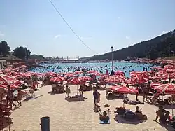 The pool has an elevation of 663 meters above sea level and a maximum depth of 1.90-2 meters, accommodating between 4,000 and 4,500 visitors. Nearby amenities include an amphitheater, two restaurants, recreational and sports courts (for basketball, volleyball, and tennis), public baths, and a children's playground.[4] Germia swimming pool, together with the surrounding area, offers a wide range of activities for visitors, including jogging, walking dogs and cats, and other recreational activities. During the summer, the pool and its surrounding areas serve as a popular gathering place for families and youth, while throughout the year, the area is used for various sports and recreational purposes.[5][6]