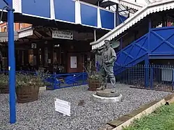 The bronze 'Railway Navvy' sculpture behind the Up platform was created by Anthony Stones who was commissioned in 1992 by the Colne Valley Park Groundwork Trust. The band Genesis contributed £3,000 towards the cost of the sculpture in appreciation of their song 'Driving the Last Spike' on their album We Can't Dance.