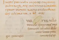 The Gesta was written between 800 and 835 at Saint-Denis under the direction of Abbot Hilduin.[1][2] The dating may be narrowed down to between 830 and 835,[2][3] or even 834–835.[4] That it was in existence by 835 is certain, since the Emperor Louis the Pious refers to it in a letter that year to Hilduin, who had probably given him a copy.[5] Although anonymous, it has been tentatively assigned to Hincmar, then a monk at Saint-Denis, on the basis of similarities in language between the Gesta and two of Hincmar's known works, the Miracula sancti Dionysii and the Vitae Remigii.[4] Laurent Morelle suggests that Hincmar was part of a team who composed the Gesta under Hilduin's direction.[6]