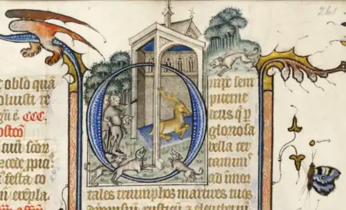 The Gesta attributes several miracles to Saint Denis to explain Dagobert's devotion to the saint and his shrine. One day, while Dagobert was still just a prince, he was chasing a stag when the animal ran into a shrine of the saint. When the hunters and dogs attempted to pursue it, they were rendered unable to move. Dagobert realized Denis's protective power. Later, after he angered his father by insulting Duke Sadragesilus of Aquitaine, he fled to a shrine contain relics of Denis and his companions. There he saw Denis in a dream and promised to build a new shrine for his tomb.[16]