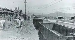 In September 1920, construction of the tunnels necessary for the pumped-storage system for the hydroelectric dams began, in June 1921 construction of the dams began, and in September 1921 construction of the railway was launched. Although the line was initially planned to be built to the 1,067 mm (3 ft 6.0 in) cape gauge in standard use in Japan, under Furukawa's guidance it was changed to standard gauge in 1921 to allow for direct interchange with Sentetsu.[4] In 1923 the first phase of construction of the railway and the hydropower stations was completed, and the opening of the line for revenue operation was scheduled for November 1923. However, the Great Kantō earthquake of that year destroyed the electric generators for the trains which had been ordered from Shibaura Manufacturing in Tokyo, setting the plans back. To compensate, steam locomotives and passenger coaches were borrowed from the South Manchuria Railway, and with these, revenue service was started on the 28.8 km (17.9 mi) section from Ch'ŏrwŏn and Kimhwa on 1 August 1924.[4] Electrification of the line was completed in October, and operation of electric trains commenced on 27 October of that year, with both steam and electric trains running until 1 January 1925.[4]