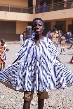 The smock is also called Bun-nwↃ or Bana by Mamprusis, fugu in Mossi, batakari in the Asante dialect, dansika in Frafra, and Banaa in Kusaal both in the upper east region.[5] It is worn by Royals and civilians across Dagbon and other northern regions, but popular across Ghana. The smock originated in the northern region of Ghana, during the reign of Yaa Naa Zanjina, but widely used in West Africa and across the world. It is similar to the national attire of Burkina Faso known as faso dan fadi.[6]