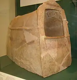 The Ghassulian stage was characterized by small hamlet settlements of mixed farming peoples, who had emigrated from the north and settled in the southern Levant: today's Jordan, Israel and Palestinian territories.[3] People of the Beersheba culture (a Ghassulian subculture) lived in underground dwellings, a unique phenomenon in the archaeological history of the region, or in trapezoidal houses of mud-brick. Those were often built partially underground (on top of collapsed underground dwellings) and were covered with remarkable polychrome wall paintings (one of the most notable examples being the 'Ghassulian Star').[3][6] Their pottery was highly elaborate, including footed bowls and horn-shaped drinking goblets,[3] indicating the cultivation of wine. Several samples display the use of sculptural decoration or of a reserved slip (a clay and water coating partially wiped away while still wet).[3] The Ghassulians were a Chalcolithic culture as they used stone tools but also smelted copper.[3][6] Funerary customs show evidence that they buried their dead in stone dolmens[7] and also practised secondary burial.[6]