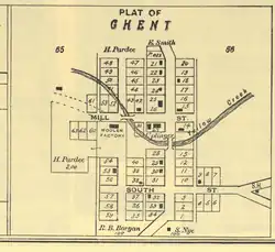 As early as 1815, the village of Ghent had several mills powered by Yellow Creek.[2] Several families had settled at Ghent by 1818.[3] A post office called Ghent was established in 1858, and remained in operation until 1918.[4] The community's name most likely commemorates the Treaty of Ghent.[5]
