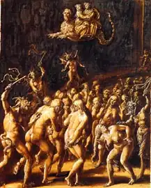 Ghisolabella is referenced in Inferno XVIII, when Dante and Virgil enter the eighth Circle of Hell, known as Malebolge.[4][5][6][7][8][9][10] In the first ditch of Malebolge, Dante and Virgil encounter two groups of sinners: the seducers and the panders.[4][5][7][8][9][10] Among the panders, Dante recognizes Venedico, who is forced to walk in a circle and endure whippings by demons.[1][4][5][7][10] Dante condemns Venedico for selling his own sister's body, through double-edged language, such as "Ma che ti mena a sì pungenti salse?" ("But what doth bring thee to such pungent sauces?" Longfellow, The Divine Comedy) (Inferno XVIII, 51), and creation of Venedico's cruelly just punishment.[4][5][9][10]