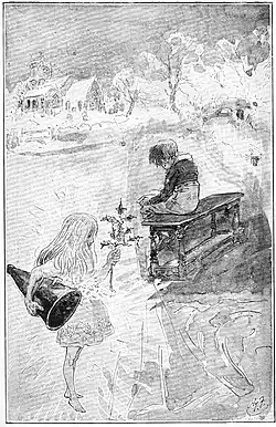 The Spirit then shows Scrooge his subsequent painful parting from his fiancée Belle and a now-married Belle with her large, happy family on the Christmas Eve that Marley died.[13] When Scrooge becomes upset by these memories, the Spirit says, "These are the shadows of the things that have been. That they are what they are, do not blame me." When Scrooge asks the ghost to remove him from the house, he "turned upon the Ghost, and seeing that it looked upon him with a face, in which in some strange way there were fragments of all the faces it had shown him". Scrooge wrestles with the ghost, crying out, "Leave me! Take me back. Haunt me no longer!" and seizes the Spirit's cap. "In the struggle, if that can be called a struggle in which the Ghost with no visible resistance on its own part was undisturbed by any effort of its adversary, Scrooge observed that its light was burning high and bright; and dimly connecting that with its influence over him, he seized the extinguisher-cap, and by a sudden action pressed it down upon its head."[8]
