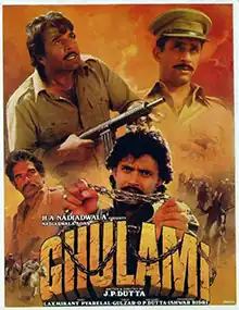 Ghulami (transl. Slavery) is a 1985 Indian Hindi-language action drama film directed by J. P. Dutta (in his directorial debut). The film features an ensemble cast of Dharmendra, Mithun Chakraborty, Mazhar Khan, Kulbhushan Kharbanda, Raza Murad, Reena Roy, Smita Patil, Anita Raj, Naseeruddin Shah and Om Shivpuri. Lyrics were by Gulzar and music composed by Laxmikant–Pyarelal, who would go on to collaborate with Dutta in all his films until Kshatriya (1993). It was shot at Fatehpur, Rajasthan. Amitabh Bachchan narrated the film.