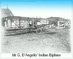 The biplane has been built by D'Angelis entirely from his own designs, experimenting with a small horse-power engine. D'Angelis seems to have been inspired by Louis Blériot who was the first to fly across the English Channel in July 1909. D'Angelis tested his aeroplane in Pallavaram, Tamil Nadu, and then arranged a public viewing in March 1910 reported by the local newspapers.[4][5]