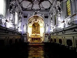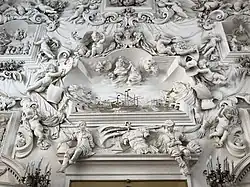 His stucco work for the oratories follows a general formula, but each elaboration is its individual tour de force. Two of the oratories are dedicated to the rosary, and the wall is divided into a series of tableaux or dioramas, each matching a Mystery of the Rosary, above these are allegorical figures or a fecundity of cherubs in playful frolic. The tableaux develops a program of prayer images, like a via crucis for contemplative prayer. The Santa Cita oratory is remarkable for its dioramas, coupled with almost genre like figures calling our attention from the moldings on which they perch. Between the doors entering the oratory is a remarkably detailed depiction of a naval battle, referencing the Battle of Lepanto. In the frames above and below are a trophy of arms, including helmets and body armor, and a Hapsburg eagle spreads its wings.