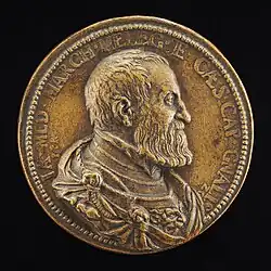 In 1543 he purchased the ancient fortified castle of Frascarolo, near present-day Induno Olona, in the Valceresio, which he converted into a sumptuous villa.[3] In the summer of 1545 he married Marzia Orsini, daughter of Ludovico Orsini, conte di Pitigliano. He was made a knight of the Order of the Golden Fleece in 1555, also the year of his death. Il Medeghino is buried in the Duomo of Milan.