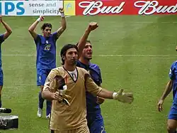 Buffon wore the captain's armband for Italy for the first time under manager Roberto Donadoni, in a 2–0 home win over Georgia in a Euro 2008 qualifier, due to the suspension of regular skipper Fabio Cannavaro.[328] He was later named Italy's second acting captain for Euro 2008 after incumbent Cannavaro was ruled out of the tournament due to injury, and as Italy's replacement captain Alessandro Del Piero was frequently deployed as a substitute. He made his first appearance as Italy's captain in the nation's opening fixture of Euro 2008 on 9 June, a 3–0 defeat to the Netherlands.[329][330][331] In the second game of the group stage against Romania on 13 June, he saved an 81st-minute penalty from Adrian Mutu to keep Italy's hopes alive following their opening defeat, as the match ended 1–1.[332] Buffon kept a clean sheet against France in the final group game, and garnered praise in the media for a notable save against Karim Benzema, as Italy won 2–0 to advance to the quarter-finals.[333] Italy were eliminated nine days later, when a 0–0 draw after extra time led to a 4–2 penalty shootout loss to eventual champions Spain; Buffon saved one penalty in the shootout[334] and was elected to the Team of the Tournament for his performances.[335]
