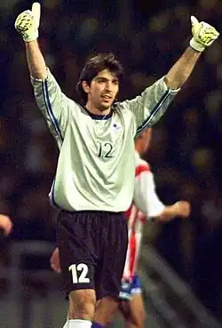 Buffon played youth football as a midfielder with La Spezia–based amateur club U.S.D. Canaletto Sepor, before returning to Carrara to play for Perticata, then Bonascola.[8] Despite offers from Bologna and Milan,[9][nb 2] Buffon began his career with the Parma youth system in 1991, as the team's coach was struck by his physical qualities.[11][10]At the youth academy, he played in several out-field positions, especially as a midfielder, before switching to goalkeeper.[12][13] His idol Thomas N'Kono inspired this change of position due to his goalkeeping for Cameroon at the 1990 World Cup; when both of the Parma youth team's keepers suddenly suffered injuries, Buffon was called upon due to his interest, height and physical attributes.[12][14][15] He quickly adapted to this role, and within two weeks he had been promoted to first keeper of the Parma youth team.[9][12]