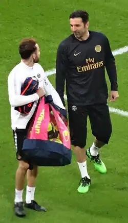 On 6 July 2018, Buffon signed a one-year contract, with the option for a second year, with Paris Saint-Germain.[244][245] He made his competitive debut for PSG on 4 August, keeping a clean sheet in a 4–0 win against Monaco in the 2018 Trophée des Champions.[246] Buffon made his Ligue 1 debut on 12 August, keeping a clean sheet in a 3–0 home win over Caen.[247] He was used in a rotational role with Alphonse Areola during the 2018–19 season by manager Thomas Tuchel.[248][249] After serving a three-match ban in UEFA club competitions, Buffon started for PSG in a 1–1 away draw against Napoli on 6 November, and was beaten by an Insigne penalty; at the age of 40 years and 282 days, he became the second-oldest player ever to make their Champions League debut for a club after Mark Schwarzer, who made his debut in the competition with Chelsea in a 1–0 home victory over Steaua București on 11 December 2013, aged 41 years and 65 days.[250][251][252] On 18 December, following an injury to Areola, Buffon played the second half of an eventual 2–1 away win over Orléans in the round of 16 of the Coupe de la Ligue.[253] PSG were eliminated from the competition in the following round after a surprise 2–1 home defeat to Guingamp on 9 January 2019, during which Buffon remained on the bench.[254]