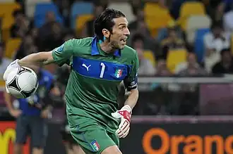 After the Euro qualification, Buffon stated that Euro 2016 would be the final European Championship of his career,[375] but expressed his intentions to retire only after the 2018 World Cup, which would see him play up to the age of 40.[376] On 31 May 2016, Buffon was named the captain of Conte's 23-man Italy squad for Euro 2016.[377] In Italy's first game of the tournament on 13 June, Buffon kept a clean sheet in a 2–0 victory over Belgium.[378] This was Buffon's 14th appearance at the European Championships, making him Italy's out-right most capped player of all time in the tournament, after overtaking Maldini, Del Piero and Cassano; with his fourth tournament appearance, he also equalled Del Piero for the most UEFA European Championships played in by an Italian player.[379] He kept another clean sheet in a 1–0 win over Sweden in Italy's second group fixture on 17 June, which allowed his nation to top the group and advance to the second round.[380] Due to fever, Buffon was rested in Italy's final group match.[381][382] He returned to the starting line-up for Italy's round of 16 fixture against Spain on 27 June, making a crucial injury time save on Gerard Piqué to earn his third consecutive clean sheet of the tournament, as Italy avenged their Euro 2012 final defeat with a 2–0 victory over the defending champions.[383] After a 1–1 draw following extra time in Italy's quarter-final fixture against Germany on 2 July, Buffon saved one penalty in the resulting shootout, although the reigning World Cup champions would ultimately emerge victorious following a 6–5 shootout loss.[384] His one on one save to deny Mario Gómez in regulation time was later nominated for the UEFA Save of the Season Award,[385] later coming in third.[386]
