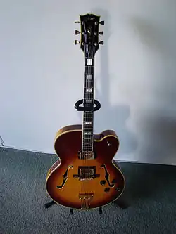 The Byrdland is the first of Gibson's Thinline series.[1] Many guitarists did not desire the bulk of a traditional archtop guitar such as Gibson's L-5, one of Gibson's top models. The Byrdland, with its overall depth of 2+1⁄4 in (5.7 cm), is thinner than the L-5's 3+3⁄8 in (8.6 cm) depth. Gibson's president, Ted McCarty, sought opinions and ideas about new products. The suggestions from Byrd and Garland led to the development of the Byrdland. The Byrdland, first made in 1955, is essentially a custom-built, thinner, L-5CES (Cutaway-Electric-Spanish). Later, the two specified a shorter scale and narrower-than-standard neck. Guitarists who had an opportunity to play Gibson samples liked the Byrdland's short scale neck (23+1⁄2 in [60 cm]), which facilitated intricate single-note patterns and unusual stretched chord voicings. The Byrdland then became a regular production instrument. One thing which hampered the instrument's popularity in the ensuing years was the narrow neck width (1+5⁄8 in [4.1 cm] at the nut, as opposed to Gibson's standard nut width of 1+11⁄16 in [4.3 cm]). Gibson developed the ES-350T from the Byrdland using less-costly hardware and detailing, and offered it as a less expensive model.[2] While that model was also designed with jazz guitarists in mind, it became synonymous with Rock 'n Roll star Chuck Berry through the late 1950s.