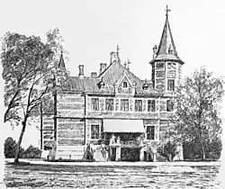 The oldest part of the main building was constructed in 1751 for Countess Anna Sophie Schack. It was expanded with an additional storey in 1847 and underwent further renovations in 1873 and 1904. The manor now appears as a two-story, white-plastered building featuring two octagonal towers and black-glazed tile roofs.