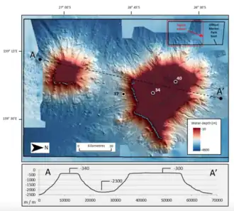 The Gifford guyots are two flat‐topped basaltic[3] seamounts, now caped with carbonate sediments with the larger Gifford Guyot dated at 15.6 million years ago[3] but the smaller unnamed seamount of unknown age. They both raise from an abyssal plain 3.4 km (2.1 mi) below sea level to generally flat summits that are about 250 m (820 ft) below sea level. This summit plateau is about 55 km2 (21 sq mi) for the unnamed guyot), and 350 km2 (140 sq mi) in area for Gifford Guyot itself.[4]