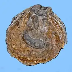 Shells of Gigantostrea gigantica can reach a size of about 100 millimetres (3.9 in).[4] These fossil shells are brittle, inequivalve, with the lower valve convex and the upper valve flat or slightly concave. The lower valve was cemented to the substrate.