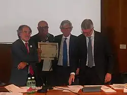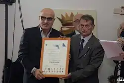 Gildo De Stefano receives the Campania Felix International Journalism Award from the president of the jury