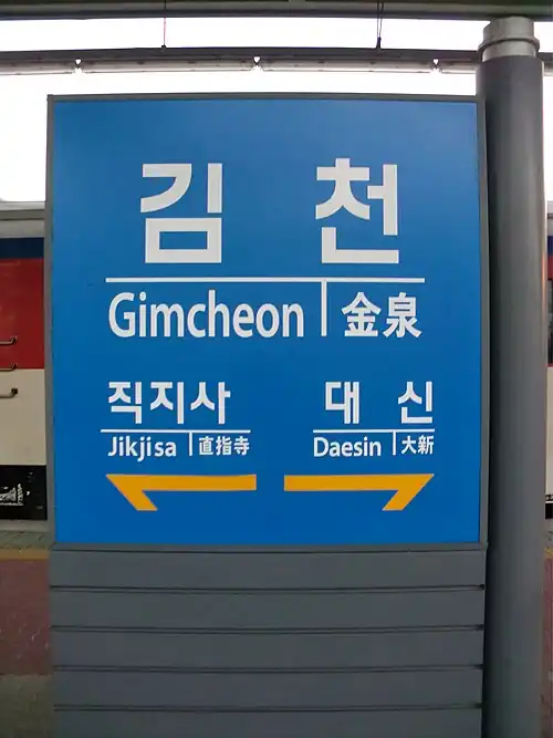 Gimcheon Station is a railway station on the Gyeongbu Line and the Gyeongbuk Line.