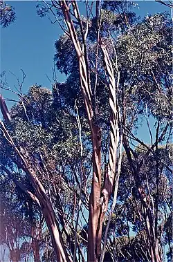 A gimlet is one of nine species of eucalypt in the genus Eucalyptus, series Contortae. These species are mainly characterised by having smooth, shiny, fluted trunks. The most widely distributed of the gimlets, is E. salubris which is found throughout the south-west of Western Australia, other than in coastal areas and wet forests.[1] The other eight species have a narrower distribution in the Goldfields-Esperance region. The only gimlet that is a mallee is E. effusa which forms a lignotuber from which it can resprout after fire. The other eight gimlets are mallets, do not form a lignotuber, are killed by fire and regenerate from seed. These species are E. campaspe, E. creta, E. diptera, E. jimberlanica, E. ravida, E. terebra, E. salubris and E. tortilis.[2][3]