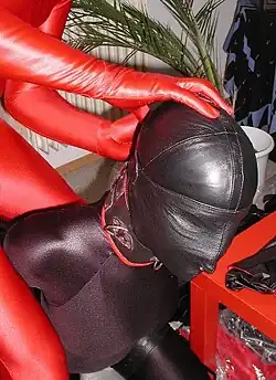 A bondage hood (also called a gimp mask or bondage mask) is a fetishistic hood.[1][2] It may be made from rubber, latex, PVC, spandex, darlexx or leather. Full-faced hoods are typically used for the practice of head bondage, and to restrain and objectify the wearer through depersonalization,[3] disorientation and/or sensory deprivation.[2]