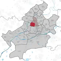 Location of Ginnheim (red) and the Ortsbezirk Mitte-Nord (light red) within Frankfurt am Main