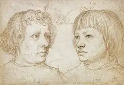 For Holbein, "everything began with a drawing".[159] A gifted draughtsman, he was heir to a German tradition of line drawing and precise preparatory design. Holbein's chalk and ink portraits demonstrate his mastery of outline. He always made preparatory portraits of his sitters, though many drawings survive for which no painted version is known, suggesting that some were drawn for their own sake.[160] Holbein produced relatively few portraits during his years in Basel. Among these were his 1516 studies of Jakob and Dorothea Meyer, sketched, like many of his father's portrait drawings, in silverpoint and chalk.[161]