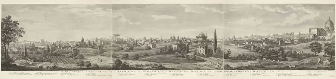 In 1771, following a suggestion of his patron Girolamo Zulian, he moved to Rome, where he founded a school of engraving and gained a reputation for his series of plates after the frescoes of the Raphael Rooms and Loggias in the Vatican (1770–77). Some of these plates[1] were hand-coloured by Francesco Panini, and did not necessarily reproduce the actual design or subjects of the Loggias' vaults and pilasters, but they became much in demand among visitors to Rome. Volpato made this impressive panorama of Rome based on Francesco Panini's drawings, part of the Rijksmuseum collection: